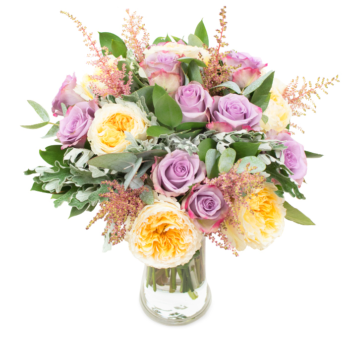 Looking for an elegant gift for a special occasion? We offer you a classy bouquet made from gorgeous purple and white roses, pink astilbe, eucalyptus leaves, senecio and ruscus that will certainly add vibrant colour and elegance to any room.