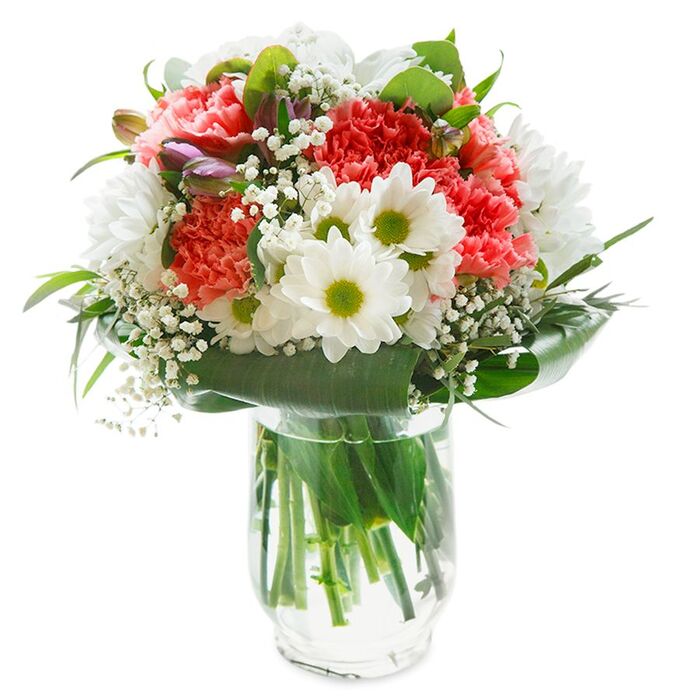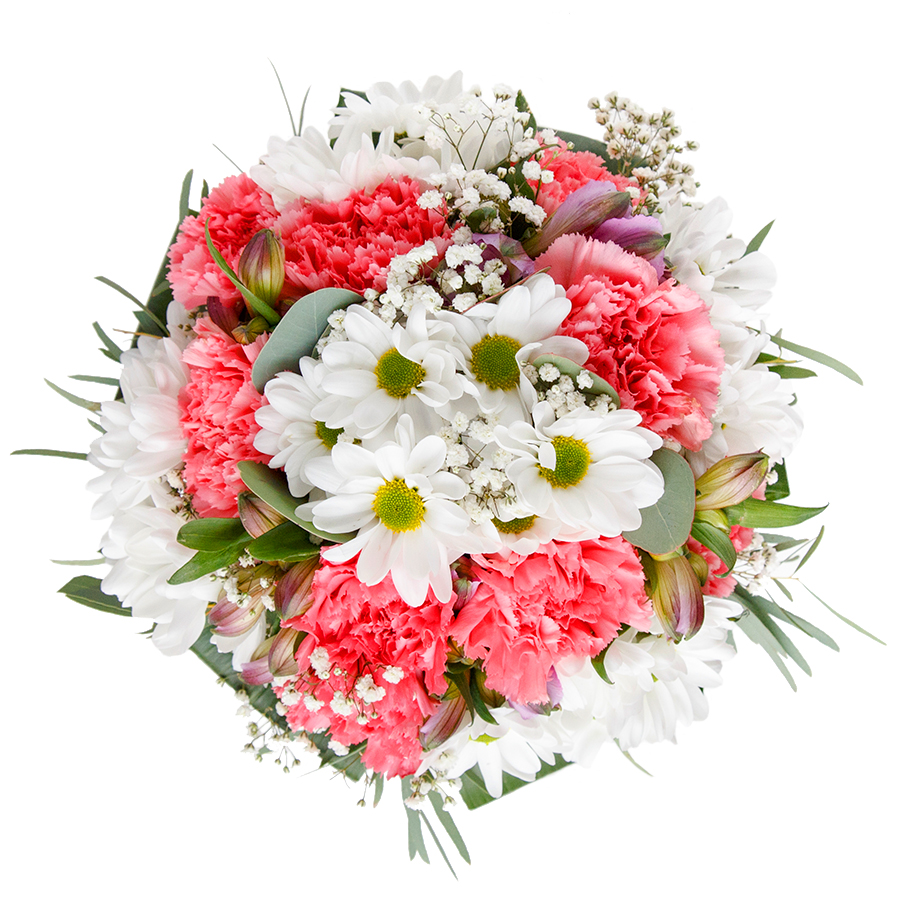 Celebrate special moments with our delicate pink and white floral ensemble. This unique bouquet combines the purity of snow-white chrysanthemums, the charm of gypsophila, the grace of light pink carnations, and the lushness of aspidistra leaves, arranged to create a harmonious and visually appealing display.